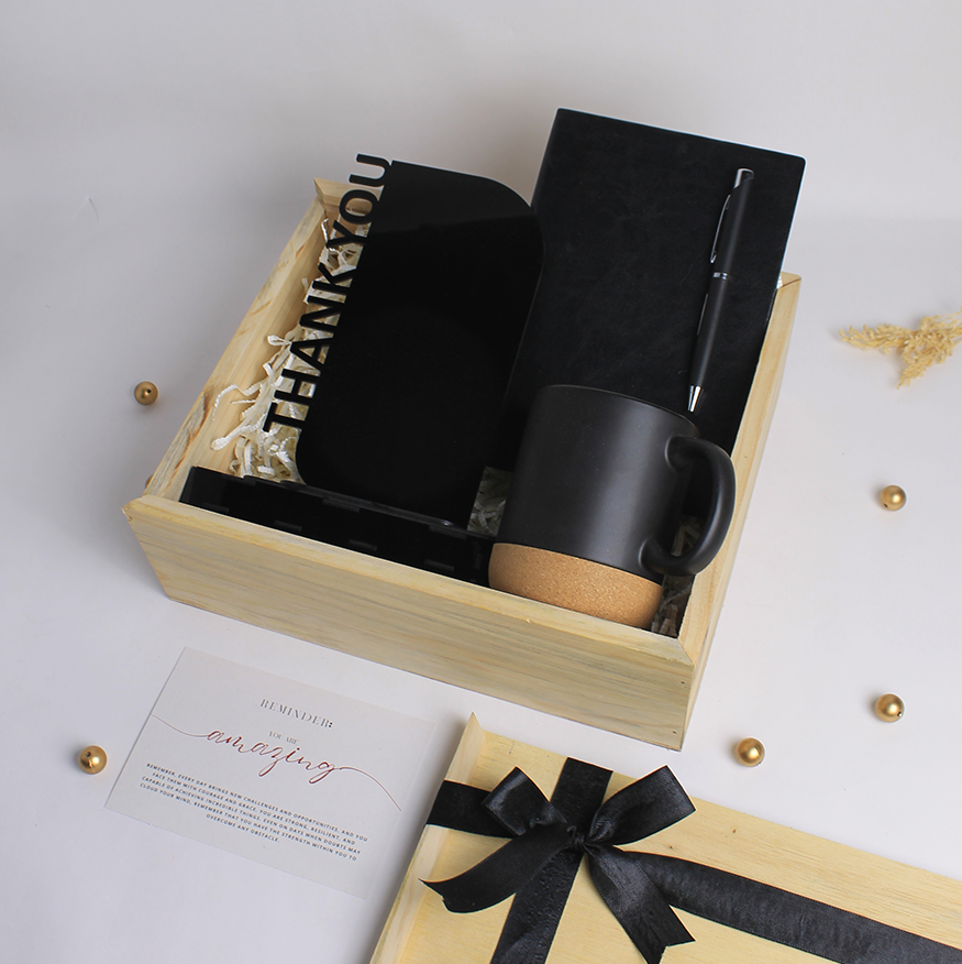 A classy New Year gift featuring a black notebook, metal pen, ceramic mug with lid and a personalised acrylic momento—packed in a premium customised wooden box. A thoughtful and elegant way to welcome 2026.
