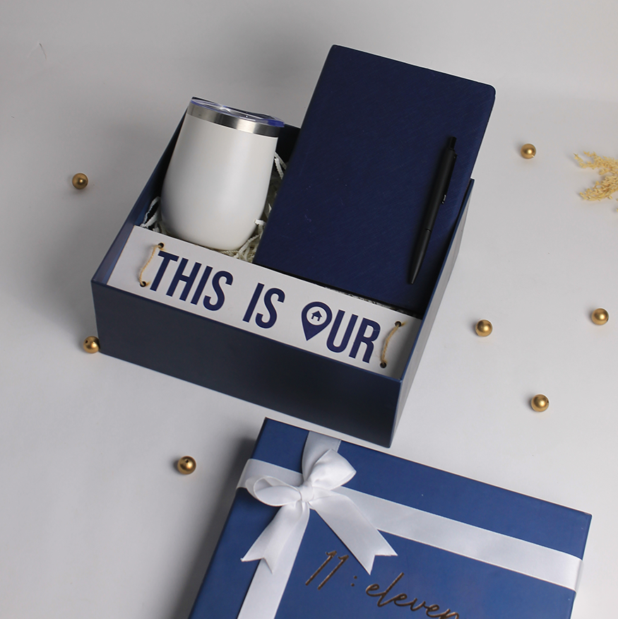 A sleek and thoughtful gift set featuring a black A5 notebook, metal pen, premium white flask and an MDF wall hanging—beautifully packed in our 11:Eleven blue hard box with a greeting card. A perfect pick-me-up gift to spread positivity and good vibes.